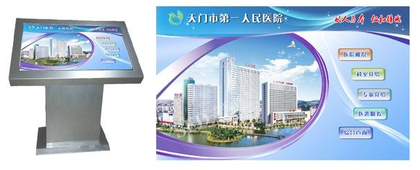 我公司为天门市第一人民医院提供的一套触摸屏信息查询系统已经启用了。这台触摸一体机配置了32寸红外触摸屏,摆放在医院诊疗大厅内,主要用来对外公开医院科室、医生等信息,并能连接医院内部HIS系统查询医药费等数据。