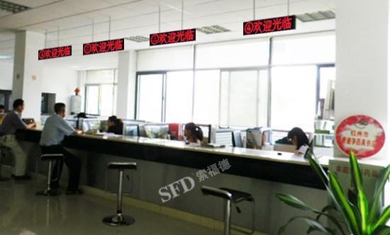 大厅里一共有五个办事柜台,每个柜台配备一个呼叫器,工作人员通过呼叫号码提醒登记人员前来柜台登记。每个工作人员台面上还配有一个评价器,办完后可对工作人员的服务进行评价。
